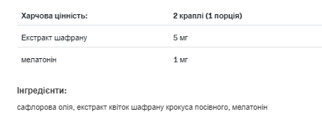 Екстракт шафрану – інгредієнт, який прискорює розслаблення тіла та допомагає підтримувати позитивний настрій. 🙂 Допомагає долати моменти слабкості, легкі депресивні стани та найголовніше – зменшує почуття стресу, що виникає протягом дня через безліч занять та обов'язків. Поєднання мелатоніну та шафрану гарантує спокій та почуття розслаблення перед сном. Ви обов'язково повинні спробувати це поєднання, і ми бажаємо вам тільки: добраніч!