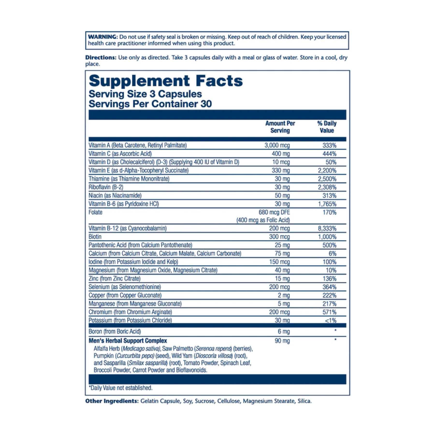 Справжня відмінність походить від спеціальних поживних сумішей, таких як Men's Support Complex. У цьому комплексі використовуються спеціально відібрані трави, такі як гарбузове насіння для підтримки простати та здоров’я артерій, а також Saw Palmetto для підтримки сечовивідних шляхів і репродуктивної системи. Концентрат біофлавоноїдів і природний каротиноїдний комплекс забезпечують антиоксидантну підтримку, допомагають організму боротися з інфекціями, а також можуть допомогти запобігти серцево-судинним захворюванням і раку. Чоловічий Golden Multi-Vita-Min, значно перевищує звичайні полівітаміни.
