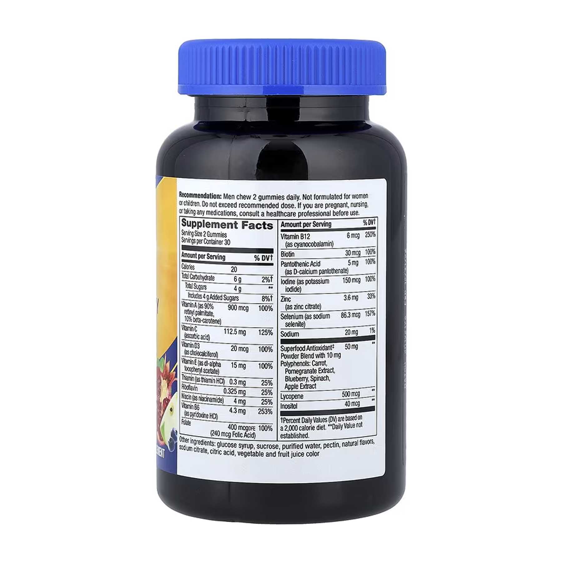 Крохмальна патока, сахароза, пектин, аскорбінова кислота (вітамін C), суміш садових фруктів і городніх овочів у вигляді порошку (апельсин, лохина, морква, гранат, слива, полуниця, груша, яблуко, буряк, малина, вишня, ананас, гарбуз, цвітна капуста, виноград, ягоди асаї, спаржа, банан, броколі, брюссельська капуста, капуста, журавлина, огірок, горох, шпинат, помідор), dl-альфа-токоферилацетат (вітамін E), лимонна кислота, d-пантотенат кальцію (пантотенова кислота), біотин, ретинілпальмітат (вітамін A), цитрат натрію, натуральні ароматизатори, цитрат цинку, йодид калію, селенат натрію, барвники (овочевий сік, фруктовий сік), рослинна олія (пальмова та кокосова), лікопін, гідрохлорид піридоксину (вітамін B6), нікотинамід, холекальциферол (вітамін D), ціанокобаламін (вітамін B12), фолієва кислота, карнаубський віск, гідрохлорид тіаміну, рибофлавін, бітартрат холіну, інозитол.
