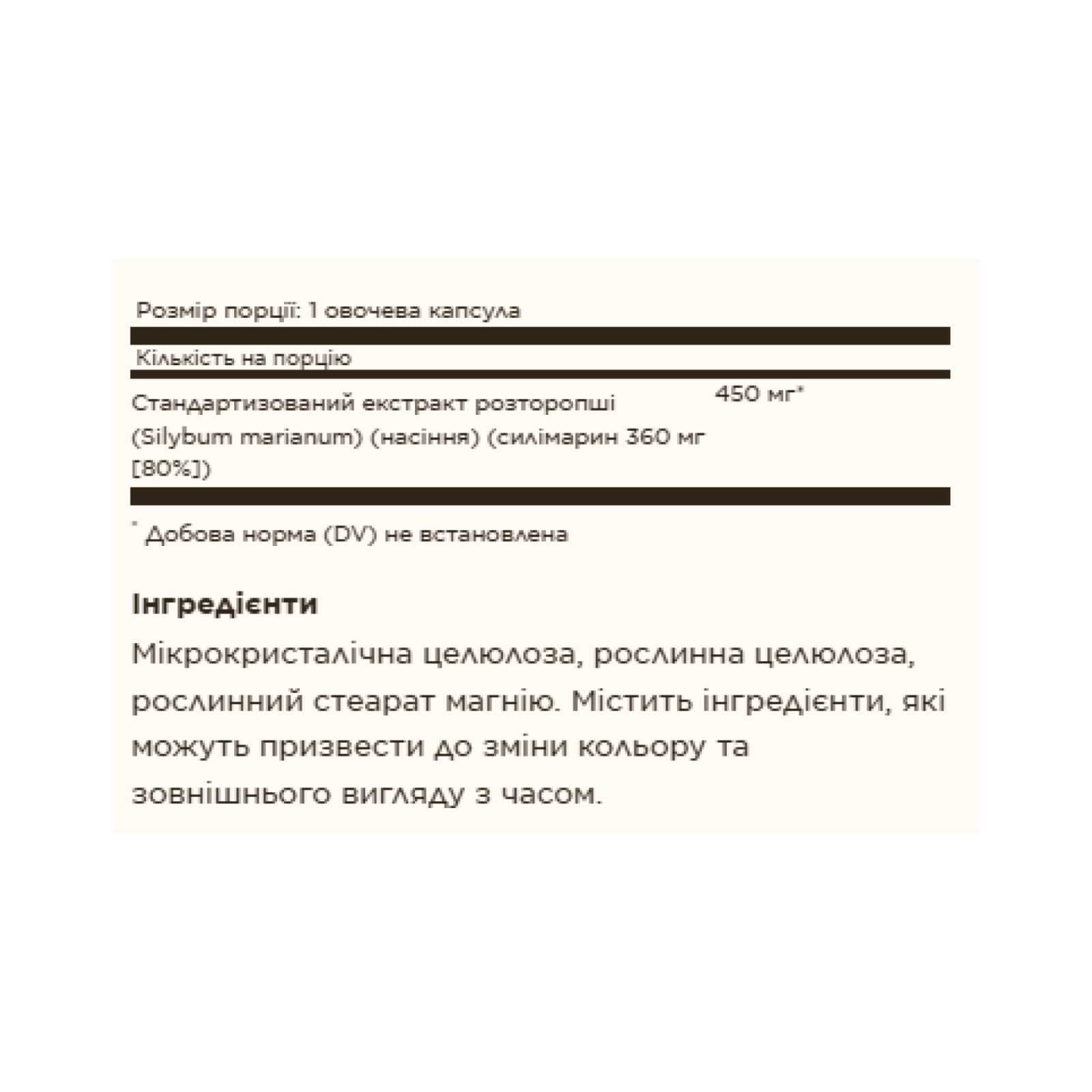 Розторопша несе в собі ефірну та жирну олію, залізо, магній, кальцій, марганець, селен, цинк, мідь, хром, рутин та безліч вітамінів.
