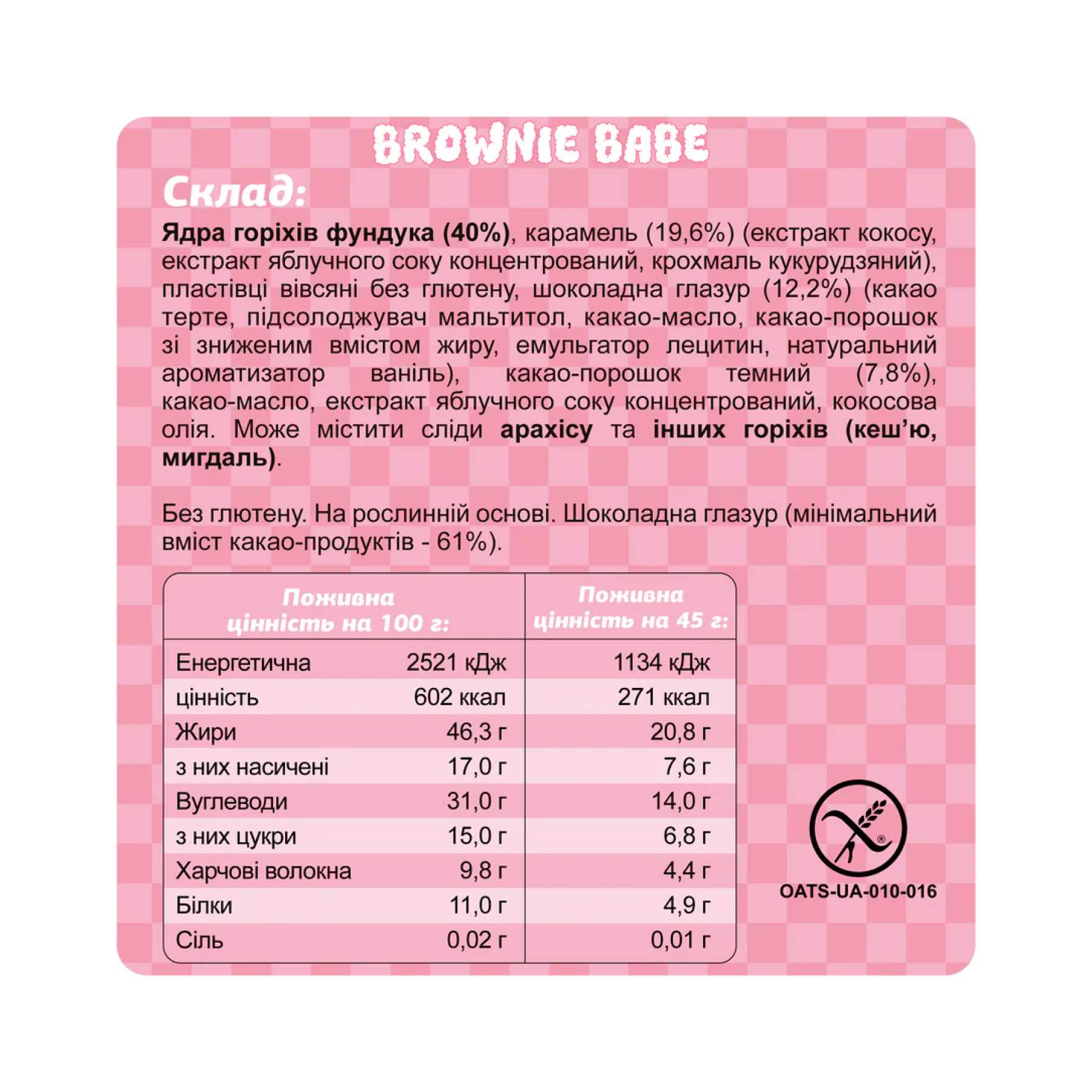 Склад: ядра горіхів фундука (40%), карамель (19,6%) (екстракт кокосу, екстракт яблучного соку концентрований, крохмаль кукурудзяний), пластівці вівсяні без глютену, шоколадна глазур (12,2%) (какао терте, підсолоджувач мальтитол, какао-масло, какао-порошок зі зниженим вмістом жиру, емульгатор лецитин, натуральний ароматизатор ваніль), какао-порошок темний (7,8%), какао-масло, екстракт яблучного соку концентрований, кокосова олія.