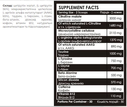 NO BOMB – революційна новинка від бренду Powerful Progress. Високоефективний передтренувальний комплекс спеціально розроблений для спортсменів, яким необхідний потужний заряд енергії перед тренуваннями. Передтренувальний комплекс NO BOMB містить найкращі та перевірені інгредієнти, які допоможуть атлету розкрити весь потенціал свого організму та відчути максимальну силу та витривалість на кожному тренуванні. З кожною порцією NO BOMB спортсмен отримує цілий комплекс вибухових компонентів, у тому числі 3000 мг високоочищеного цитруліну малату, у тому числі 1680 мг L-цитруліну, що допомагає покращити фізичну форму та спортивні показники завдяки підвищеній витривалості під час аеробних тренувань та змагань. Ще у складі передтренувального комплексу NO BOMB є цілих 1370 мг L-аргінін альфа-кетоглутарату, у тому числі 890 мг AAKG, що значно підвищує продуктивність тренувань. Ідеальна комбінація L-аргініну та кетоглютарату альфа є ключовою у метаболізмі амінокислот і бере участь у синтезі білка, сильно підвищуючи рівень азоту, що важливо для зростання м'язів. Ключові переваги перед тренувальним комплексом NO BOMB: значно підвищує силу та витривалість при інтенсивних тренуваннях; сприяє швидкому відновленню м'язових тканин; підвищує продуктивність та працездатність; зміцнює імунну систему та регулює рівень холестерину в крові. Склад в одній порції – 2 мірні ложки (10 г): Цитрулін малат – 3000 мг серед них цитрулін – 1680 мг Целюлоза мікрокристалічна – 2110 мг L-аргінін альфа-кетоглютарат – 1370 мг Серед них AAKG – 890 мг тирозин – 750 мг L-лізин – 700 мг Бета-аланін – 530 мг Діоксид кремнію – 370 мг Кофеїн – 130 мг Вітамін В12 – 110 мг Склад: Цитрулін малат (L-цитрулін 56%), мікрокристалічна целюлоза, L -кетоглутарат (AAKG 65%), таурин, L-тирозин, L-лізин, бета-аланін, діоксид кремію, кофеїн, вітамін В12, натуральний аромат та підсолоджувачі.
