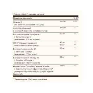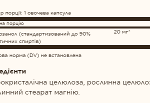Не містить глютену, пшениці, молочних продуктів, сої, дріжджів, цукру, натрію, штучних ароматизаторів, підсолоджувачів, консервантів і барвників.