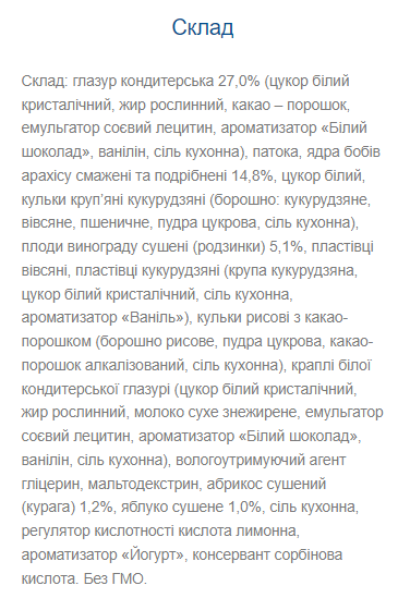 Особливості батончика-мюслі: Горіховий батончик – мюслі з фруктами глазурований Nutty Way Склад: глазур кондитерська (цукор білий кристалічний, жир рослинний, какао – порошок, емульгатор соєвий лецитин, ароматизатор «Білий шоколад» ванілін, сіль кухонна), патока, ядра бобів арахісу смажені та подріблені 14,8%, цукор білий, кульки круп’яні кукурудзяні (борошно: кукурудзяне, вівсяне, пшеничне, пудра цукрова, сіль кухонна), плоди винограду сушені (родзинки) 5,1%, пластівці вівсяні, пластівці кукурудзяні (крупа кукурудзяна, цукор білий кристалічний, сіль кухоона), краплі білої кондитерської глазурі (цукор білий кристалічний, жир рослинний, молоко сухе знежирене, емульгатор соєвий лецитин, ароматизатор «Білий шоколад», ванілін, сіль кухонна), вологоутримуючий агент гліцерин, мальтодекстрин, абрикос сушений (курага) 1,2%, яблуко сушене 1%, сіль кухонна, регулятор кислотності кислота лимонна, ароматизатор «Йогурт», консервант сорбінована кислота. Без ГМО. Маса нетто: 40 g (г) мінус 9%. Поживна (харчова) цінність на 100 g (г) продукту: білки – 4,2 g (г); вуглеводи – 59,3 g (г). Енергетична цінність (калорійність) на 100 g (г) продукту: 1705 kJ (кДж) / 408 kcal (ккал).