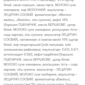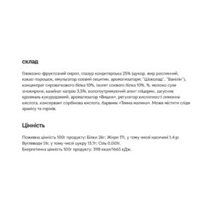 глазур кондитерська 27,0% (цукор білий кристалічний, жир рослинний, какао – порошок, емульгатор соєвий лецитин, ароматизатор «Білий шоколад», ванілін, сіль кухонна), патока, ядра бобів арахісу смажені та подрібнені 14,8%, кульки круп'яні кукурудзяні (борошно: кукурудзяне, вівсяне, пшеничне, пудра цукрова, сіль кухонна), плоди винограду сушені (родзинки) 5,1%, пластівці вівсяні, пластівці кукурудзяні (крупа кукурудзяна, цукор білий кристалічний, сіль »), кульки рисові з какао-порошком (борошно рисове, пудра цукрова, какао-порошок алкалізований, сіль кухонна), краплі білої кондитерської глазурі (цукор білий кристалічний, жир рослинний, молоко сухе знежирене, емульгатор соєвий лецитин, ароматизатор « , ванілін, сіль кухонна), вологоутримуючий агент гліцерин, мальтодекстрин, абрикос сушений (курага) 1,2%, яблуко сушене 1,0%, сіль кухонна харчова, регулятор кислотності кислота лимонна, ароматизатор Йогурт», консервант сорбінова кислота. Без ГМО.