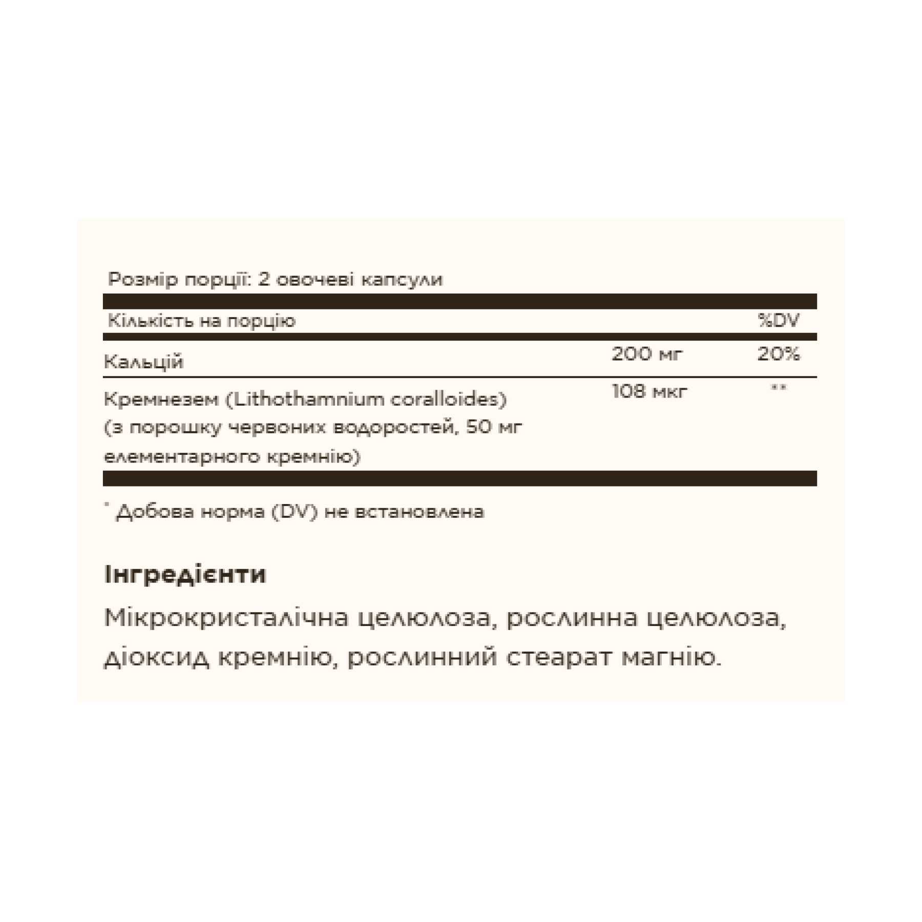 Мікрокристалічна целюлоза, рослинна целюлоза, діоксид кремнію, рослинний стеарат магнію.