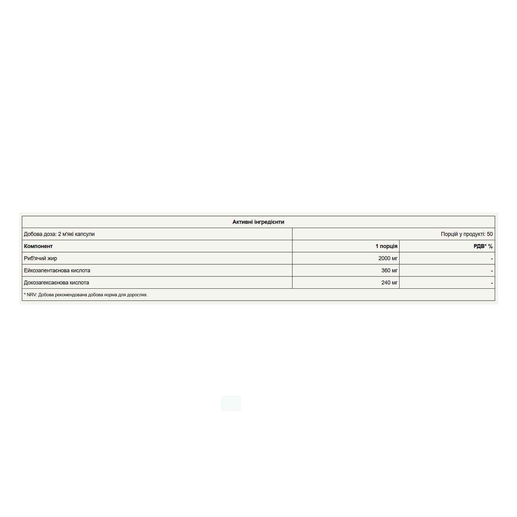 Приймайте 2 м’які капсули (1 порцію) щодня під час їжі. Рекомендована добова норма споживання – 1 порція. Щоб скласти раціон, який відповідає вашим індивідуальним потребам, рекомендуємо проконсультуватися з дієтологом.