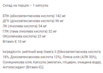 Кожна порція (1 капсула) містить: ЕПК (ейкозапентаєнова кислота): 142мг ДГК (докозагексаєнова кислота): 96мг ЛК (лінолева кислота): 54мг ГЛК (гама лінолева кислота): 32мг ОК(олеїнова кислота) 83% РДН*) *Рекомендована Денна Норма