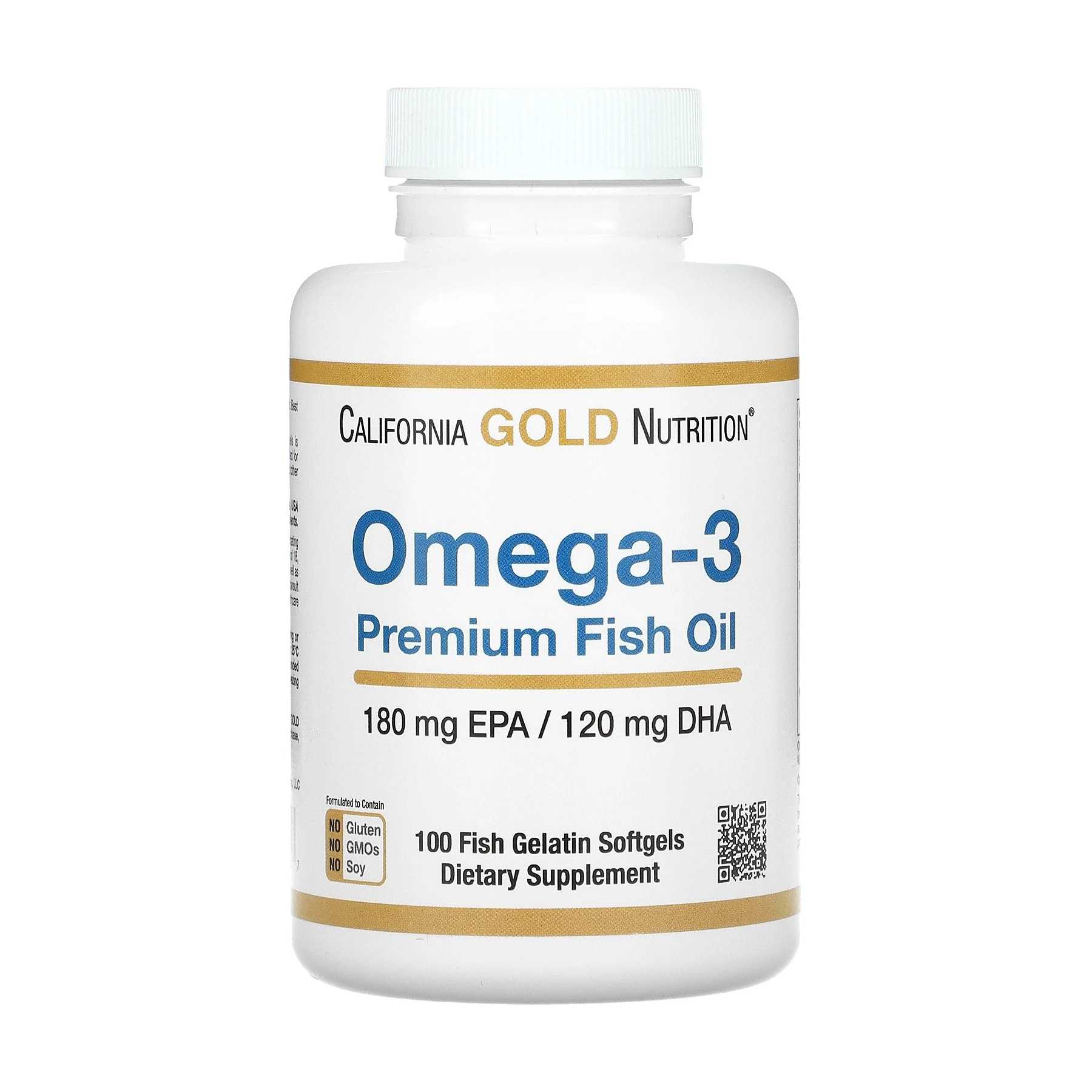 Риб’ячий жир California Gold Nutrition Omega-3 Premium Fish Oil молекулярно дистильований і містить 180 мг EPA та 120 мг DHA на капсулу високоочищеного та концентрованого натурального риб’ячого жиру зі світових джерел, який відповідає суворим стандартам контролю якості. М’які капсули з риб’ячого желатину не містять свиней і рогатої худоби та виробляються в Каліфорнії, США, з інгредієнтів з міжнародних джерел.