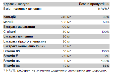 Склад:  Карбонат кальцію, оксид магнію, харчовий желатин, витанія сонна (корінь) 5:1 екстракт, аскорбінова кислота, Rosa canina (плоди) 20:1 екстракт, Citrus aurantium (плоди) 5-6:1 екстракт, Panax ginseng (корінь) ) Екстракт 4:1, засіб проти злипання (діоксид кремнію), ніацин, DL-альфа-токоферилацетат, пантотенова кислота, барвник (оксид заліза), піридоксин гідрохлорид.