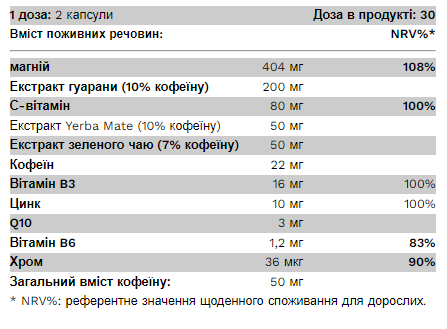 Склад: Оксид магнію, желатин харчовий, екстракт Paullina cupana (насіння) 2-4:1, аскорбінова кислота, трімагнію цитрат ангідрат, магнію бісгліцинат, Ilex paraguariensis (лист) 4-8:1 екстракт, Camelia sinensis (лист) 3-4 :1 екстракт, Coffea robusta (насіння) 12:1 екстракт, натуральний кофеїн (з кавових зерен), ніацин, оксид цинку, діоксид кремнію, Q10, піридоксину гідрохлорид, хрому піколінат.