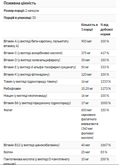 Містить денну норму заліза, цинку та інших мінералів та 150 мг кальцію.