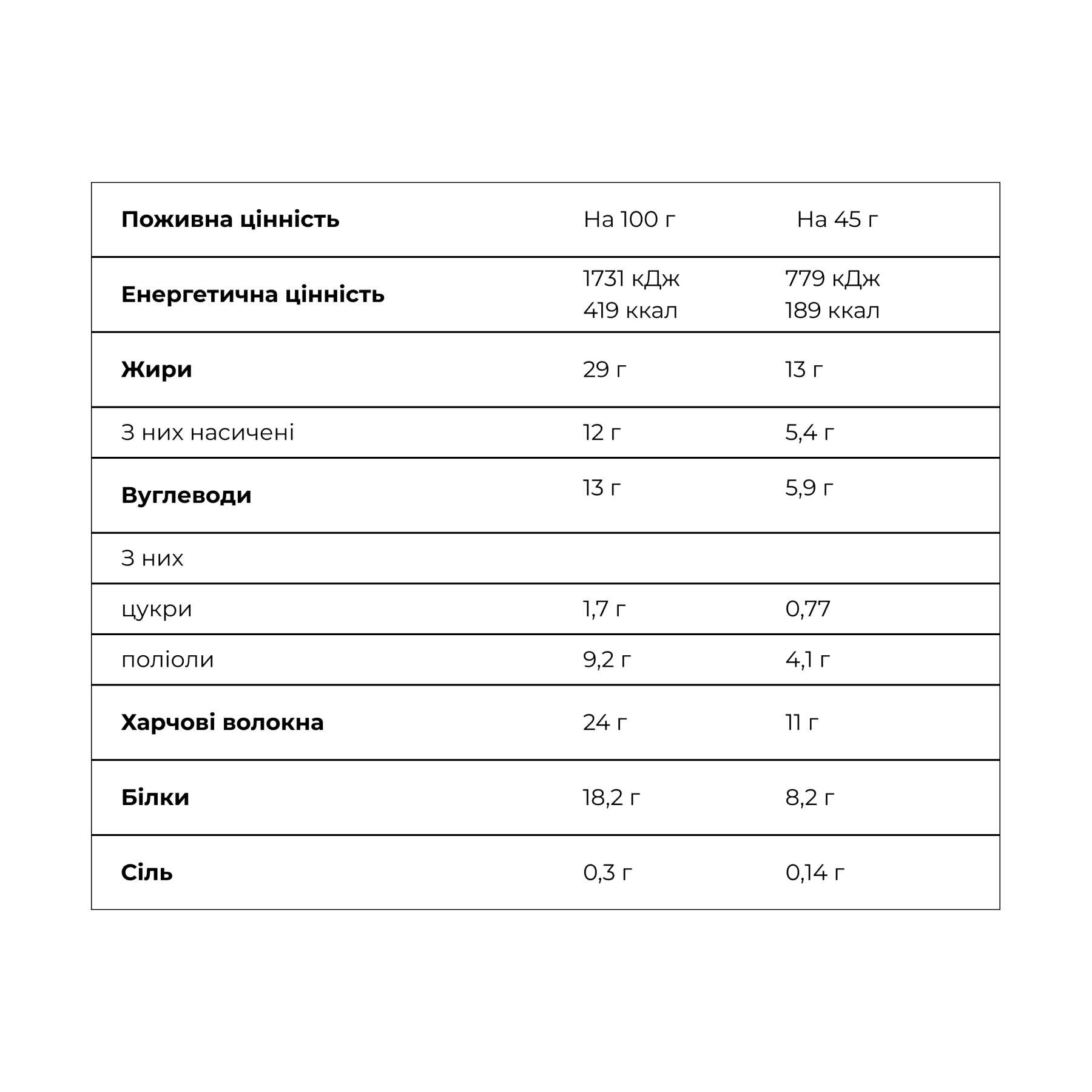 Склад: молочний шоколад 16% (масло какао, харчові волокна – полідекстроза, сироватка молочна суха, підсолоджувачі (мальтит, стевіол глікозиди зі стевії), молоко сухе знежирене, какао-порошок, емульгатор – соєвий лецитин, натуральний ванільний ароматизатор), арахіс, суміш білків (концентрат сироваткового білку [молоко], концентрат молочного білку), карамель з підсолоджувачами 13,5% (харчові волокна – ізомальтоолігосахарид, підсолоджувачі (сорбіт, мальтит), вологоутримуючий агент – гліцерин, молоко сухе знежирене, кокосова олія, емульгатор – моно- та дигліцериди жирних кислот, натуральний ароматизатор), харчові волокна – ізомальтоолігосахарид, смажений мигдаль 10%, кокосова олія, вологоутримуючі агенти (гліцерин, сорбітол), натуральний ароматизатор, емульгатор – моно- та дигліцериди жирних кислот, антиоксиданти – вітамін E (токоферол), регулятор кислотності – лимонна кислота. Може містити сліди яєць.