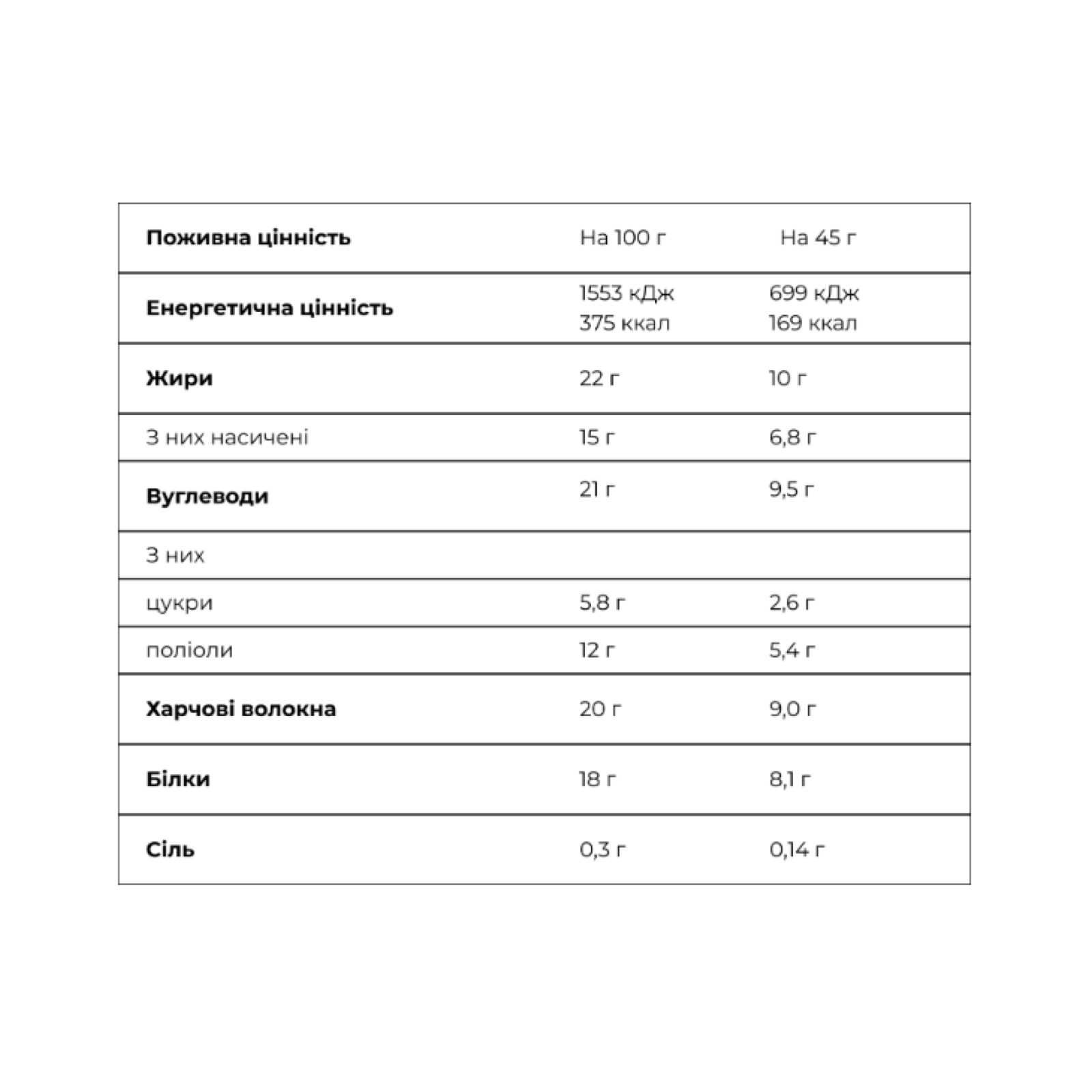 Склад: молочний шоколад 29 % (масло какао, харчові волокна – полідекстроза, сироватка молочна суха, підсолоджувачі (мальтит, стевіол глікозиди зі стевії), молоко сухе знежирене, какао-порошок, емульгатор – соєвий лецитин, натуральний ванільний ароматизатор), суміш білків (концентрат сироваткового білку [молоко], концентрат молочного білку), карамель з підсолоджувачами 8,6 % (харчові волокна – ізомальтоолігосахарид, підсолоджувачі (сорбіт, мальтит), вологоутримуючий агент – гліцерин, молоко сухе знежирене, кокосова олія, емульгатор – моно- та дигліцериди жирних кислот, натуральний ароматизатор), харчові волокна – ізомальтоолігосахарид, арахіс 7%, кокосова олія, вологоутримуючі агенти (гліцерин, сорбітол), фініки, хрусткі кульки 3,5% (рисова крупа, сіль), натуральний ароматизатор, емульгатор – моно- та дигліцериди жирних кислот, антиоксиданти – вітамін E (токоферол), регулятор кислотності – лимонна кислота. Може містити сліди горіхів, яєць.