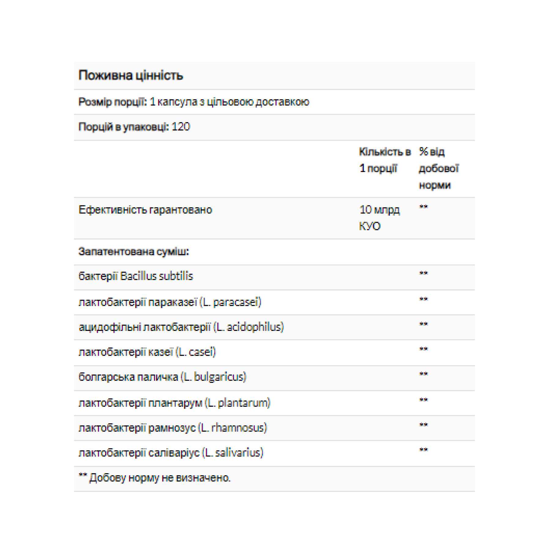 8 штамів пробіотиків забезпечують 10 мільярдів КУО в одній капсулі