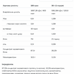 Змішайте одну порцію порошку (28 г = 1 мірна ложка = 2 столові ложки) з 250 мл води або знежиреного молока. Приймайте по 2 порції щодня.