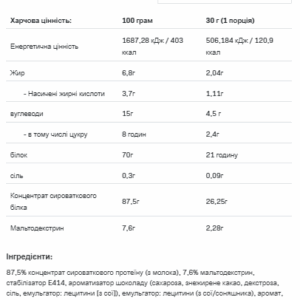 Змішайте одну порцію порошку (28 г = 1 мірна ложка = 2 столові ложки) з 250 мл води або знежиреного молока. Приймайте по 2 порції щодня.