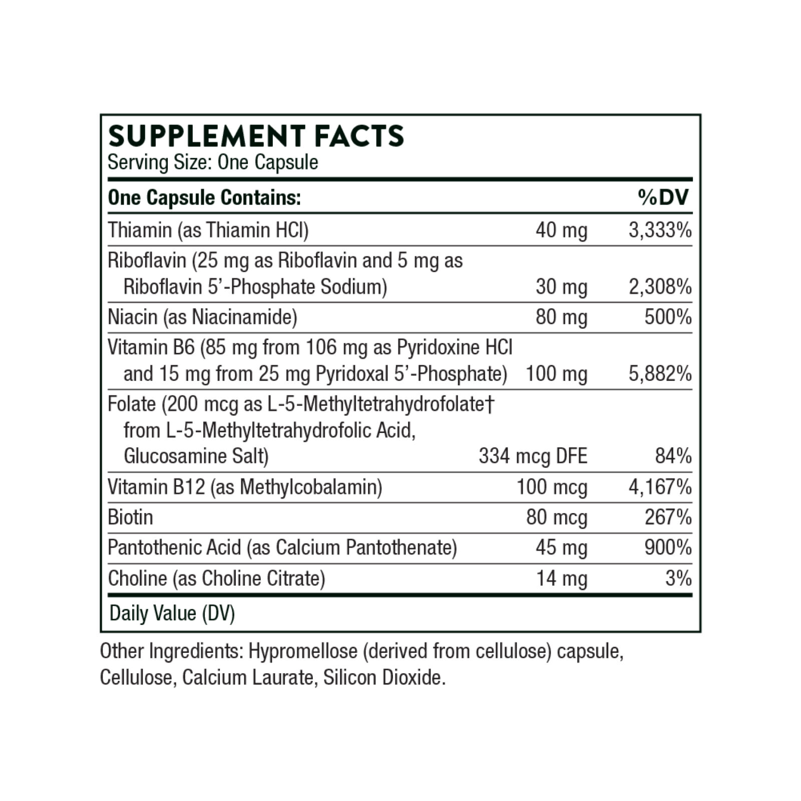 Комплекс вітамінів групи В № 6 має сертифікат NSF Sport®. Більшість вітамінів групи B (крім вітаміну B12) не зберігається в організмі. Відповідно, їх необхідно щодня отримувати з їжі для підтримки міцного здоров’я. Комплекс вітамінів B № 6 від Thorne містить оптимально збалансовану кількість вітамінів групи В й додатковий вітамін B6. Комплекс вітамінів групи В № 6 містить тіамін (вітамін В1), рибофлавін і рибофлавін 5'-фосфат (вітамін В2), нікотинамід (вітамін В3), пантотенову кислоту (вітамін В5), піридоксин і піридоксаль 5'-фосфат (вітамін B6), метилкобаламін (вітамін В12), метилфолат (5-MTHF) і біотин. Незважаючи на те, що кожен вітамін групи В хімічно відрізняється один від одного, вони доповнюють один одного в різних біохімічних функціях у всьому організмі — від вироблення клітинної енергії до утворення еритроцитів і підтримки нервової системи. Комплекс вітамінів групи B № 6 містить піридоксин і активний пиридоксаль-5'-фосфат для підтримки роботи мозку за допомогою синтезу нейромедіаторів. Він також підтримує неврологічну функцію за допомогою формування мієлінової оболонки, що оточує нервові клітини. Крім того, вітамін B6 може допомогти полегшити симптоми затримки рідини й підтримувати хороший настрій під час ПМС.