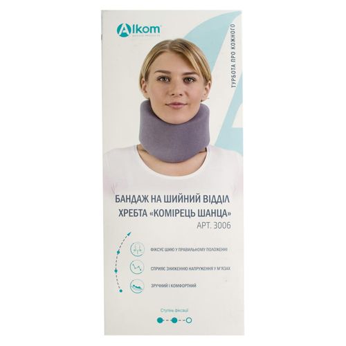 Стабілізуюча шина на шию Алком 3006 забезпечує помірну фіксацію шийного відділу хребта, допомагає прибрати асиметричне скорочення м’язів, захищає хребет від зсувів. Шина зменшує біль в період загострення і допомагає при широкому спектрі хвороб: від головного болю і запаморочення до родових травм.