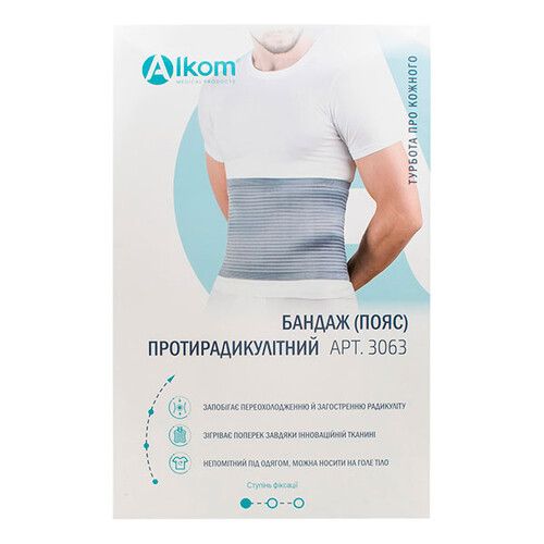 Бандаж (пояс) протирадикулітний Алком 3063 знімає больові відчуття в області попереку, фіксує і захищає від різких поворотів спини. Бандаж виготовлений із сучасного матеріалу з високим вмістом вовни, тому він добре зберігає тепло тіла та не дає спині переохолоджуватися. Не скручується, не сповзає, не заважає рухатися. Надає всі переваги, як і засоби з натуральної вовни, але міцніший, зносостійкий і гігієнічний. Не спричиняє алергій і подразнень на шкірі. Майже непомітний під одягом.