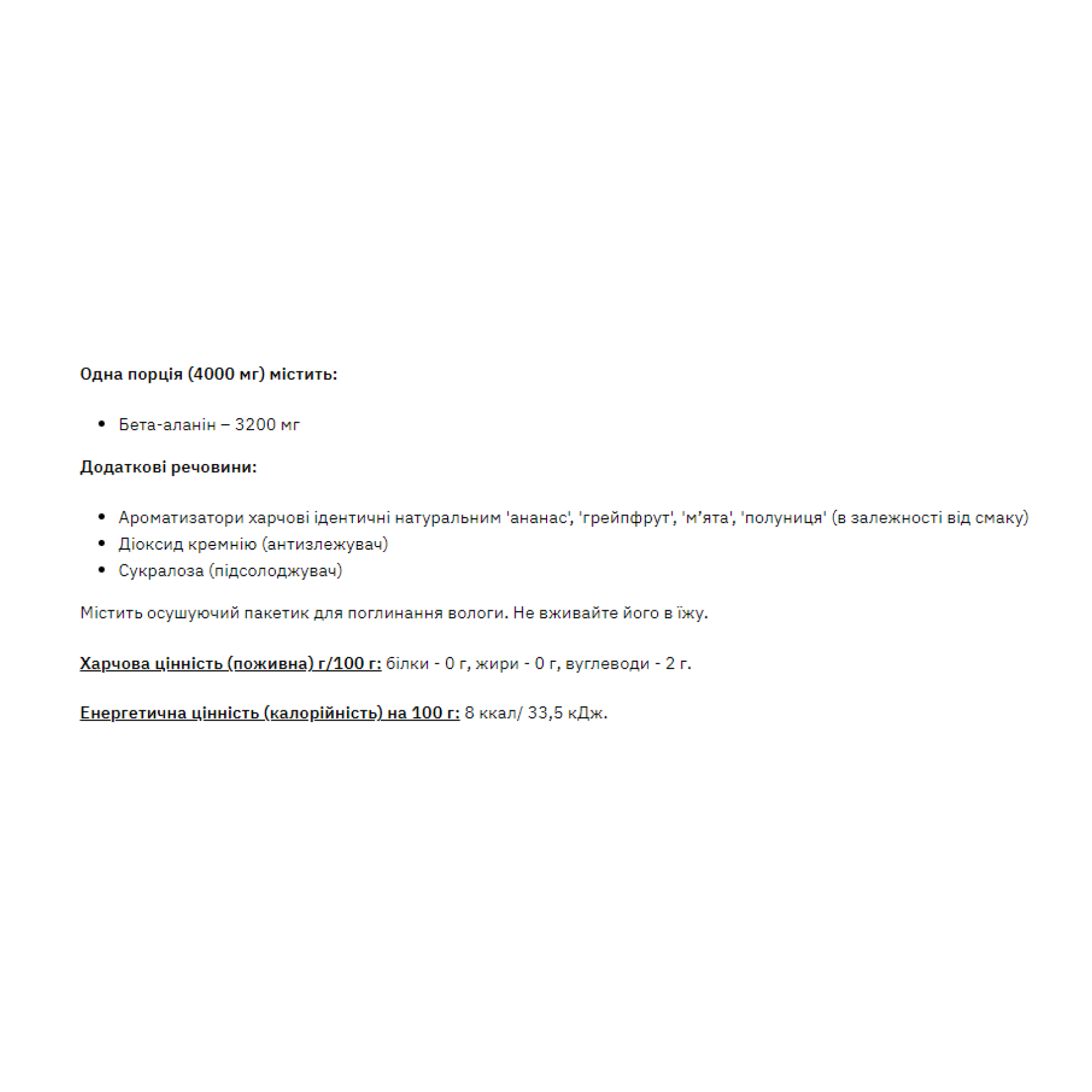 Харчова добавка Stark Pharm – Stark Beta-Alanine Delicious містить замінну амінокислоту бета-аланін, доповнену смаковими добавками. Представлена в двох смакових варіаціях: ананас-грейпфрут і полуниця-м’ята.
