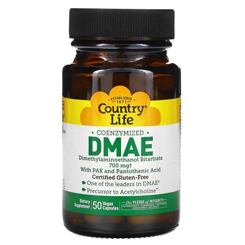 DMAE (диметиламіноетанол) Country Life є природним аміноспиртом, який знаходиться в мізерно малих кількостях у головному мозку. Він, як правило, розглядається як попередник холіну, який необхідний мозку для виробництва ацетилхоліну, нейромедіатора, що бере участь у передачі нервових сигналів та здорового функціонування мозку.