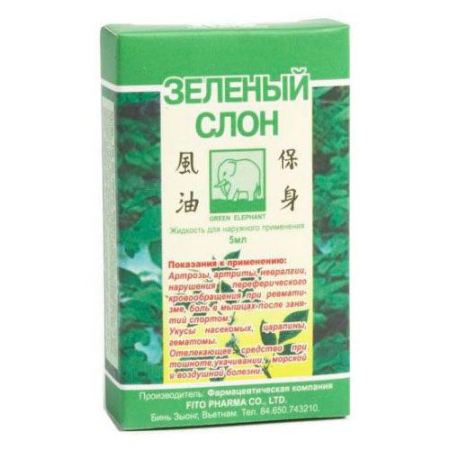 Зелений слон – бальзам для зовнішнього застосування, що має протизапальну, знеболювальну, зігрівальну дію. Полегшує головний, зубний, менструальний біль. Корисний при простудних захворюваннях, болю в горлі, отруєнні. Ефективний засіб при закачуванні, нудоті, головному болю.