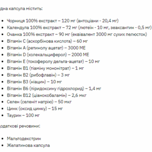 Мікрокристалічна целюлоза, рослинна целюлоза (капсула), мальтодекстрин, стеаринова кислота, діоксид кремнію.