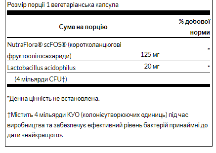 Swanson ProLacto Acidophilus — це чудова ацидофільна добавка, що містить 4 мільярди КУО у вегетаріанських капсулах, щоб безпечно доставляти пробіотичні навантаження в нижню частину кишкового тракту, де вони проявляють свою захисну дію. Такі пробіотики, як ацидофілін, підтримують здоров’я травлення та імунітету. Не потребує охолодження.