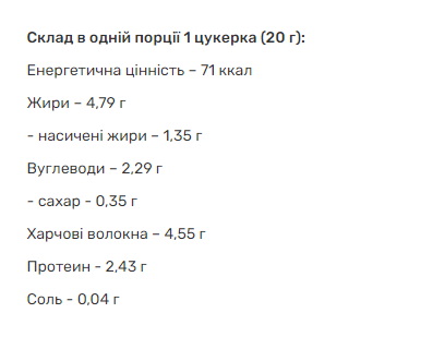 Склад: арахіс-40%, ізомальтоолігосахарид, глазур (олія кокосова, мальтитол, какао-порошок, ванілін, лецитин) – 20%, вершки кокосові сухі, вологоутримуючий агент (харчовий гліцерин), загусник (карагінах), ароматизатор , «карамель», ванілін, сіль, консервант (сорбінова кислота), регулятор кислотності (лимонна кислота).