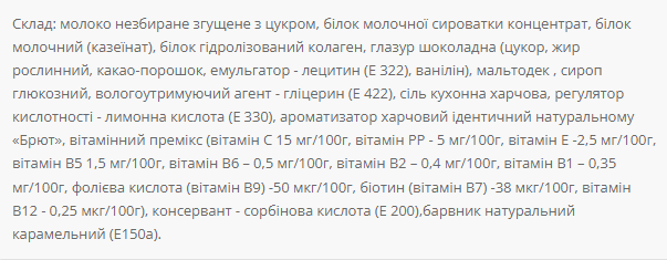 Склад: ізомальтосахарид, протеїни (концентрат сироваткового білка, казеїнат, гідролізований колаген, ізолят соєвого білка) – 36%, кокосові вершки, глазур кондитерська (ізомальтосахарид, жир кокосовий, какао-порошок, молоко сухе знежирене). (гліцерин), регулятор кислотності – лимонна кислота (Е330), ароматизатор “Горіховий”.