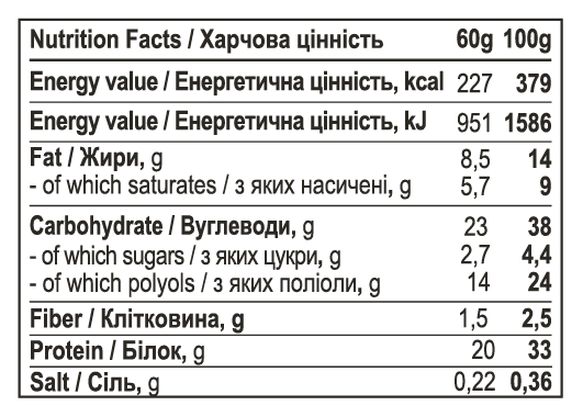 У складі продукту є молочнии білок 23%, карамель 16%, молочнии шоколад зпідсолоджувачем 16%, зволожувач гліцерин, підсолоджувач мальтит, пептиди колагену, кокосова олія, соєвии білок 3,2%, соєві чіпси з какао, какао-порошок, олігофруктоза, емульгатор соняшниковии лецитин, ароматизатори.