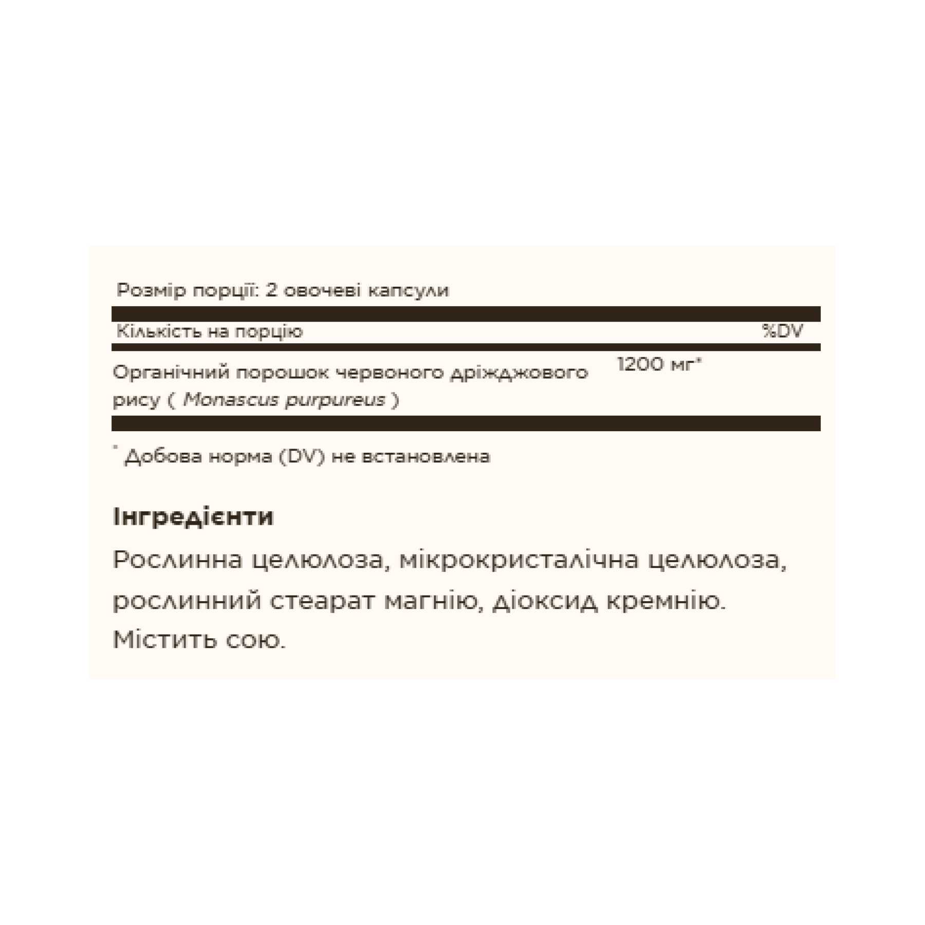 Рослинна целюлоза, мікрокристалічна целюлоза, рослинний стеарат магнію, діоксид кремнію. Містить сою.