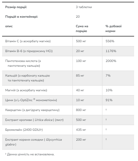 Під час виробництва не використовуються пшениця, глютен, соя, молоко, яйця, риба, молюски та інгредієнти з деревних горіхів. Виробляється на підприємстві, що має реєстрацію поточної належної виробничої практики (GMP), де виконується обробка інших інгредієнтів, що містять ці алергени.