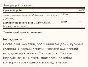 Ресвератрол – це природний поліфенол, який міститься в червоному вині, арахісі та деяких рослинах, включаючи траву Polygonum cuspidatum. Це невелика молекула, класифікована як стильбен. Поліфеноли, такі як ресвератрол, мають антиоксидантні властивості, які допомагають боротися з вільними радикалами в організмі. Вільні радикали можуть сприяти окислювальному стресу та, у свою чергу, можуть сприяти передчасному старінню клітин. Кожна овочева капсула містить більше ресвератролу, ніж звичайна пляшка червоного вина.
