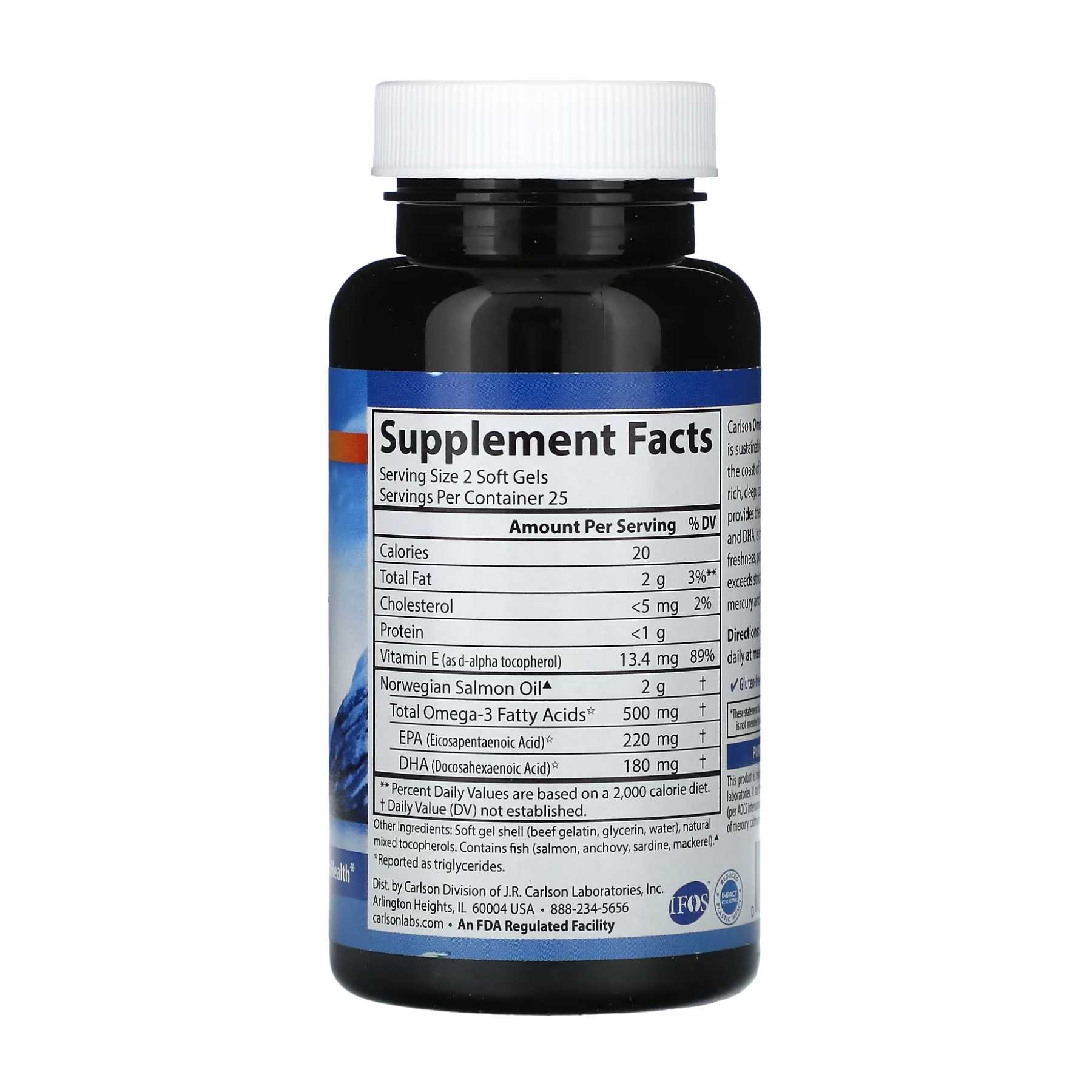 Лососевий жир, збагачений омега-3 жирними кислотами Carlson, отримують екологічно чистим шляхом із лосося біля берегів Норвегії та інших глибоководних холодноводних риб, багатих омега-3 жирними кислотами. Лососевий жир містить корисні омега-3 кислоти ЕПК і ДГК; має сертифікати свіжості, ефективності та чистоти третьою стороною; і перевищує суворі стандарти тестування на вміст ртуті та інших забруднювачів.