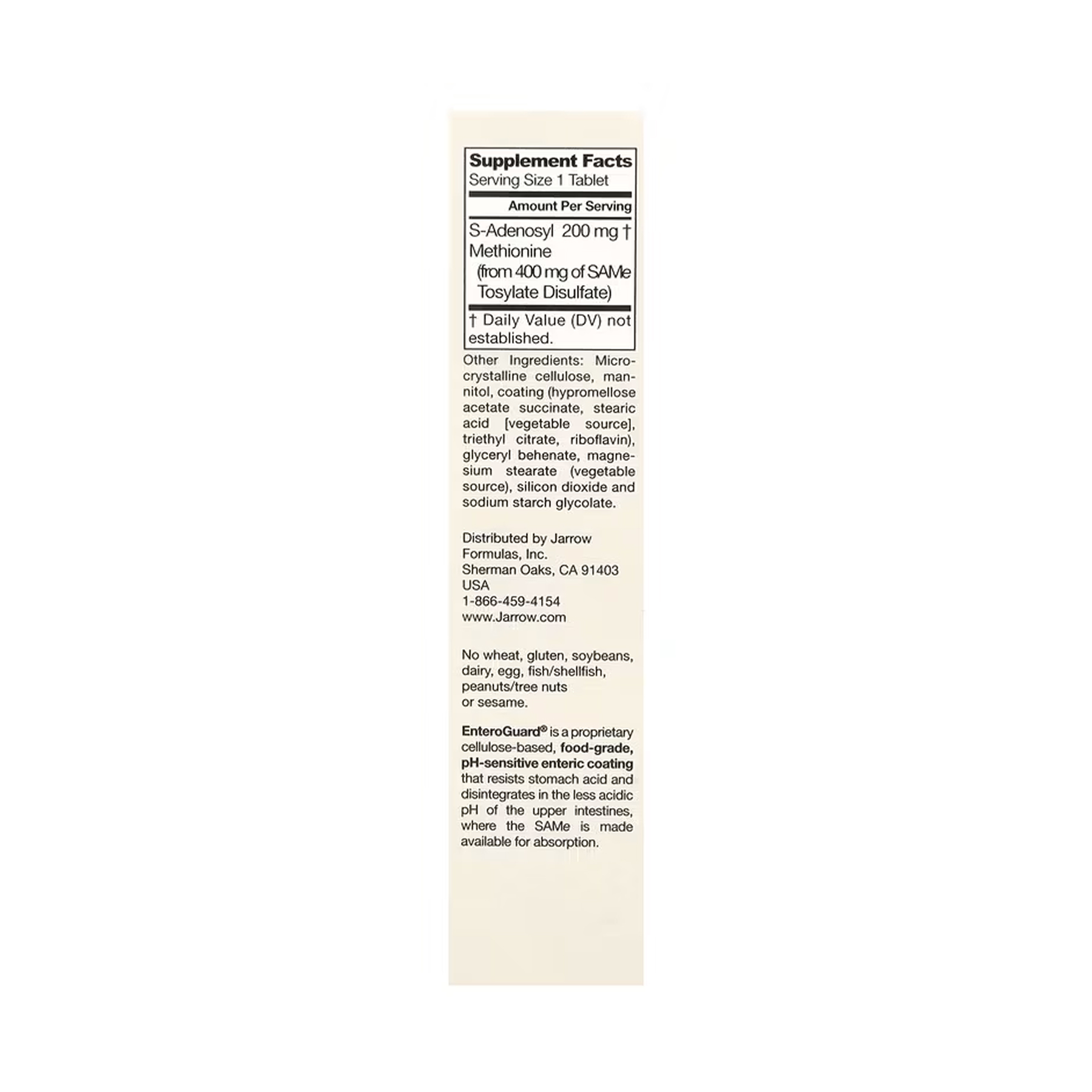 SAMe 200 від Jarrow Formulas® забезпечує повний вихід 200 мг SAMe (чистий вихід) із 400 мг тозилатдисульфату SAMe. SAMe 200 виготовляється при низькій температурі та низькій вологості та має кишковорозчинну оболонку, що забезпечує біологічно активний продукт.