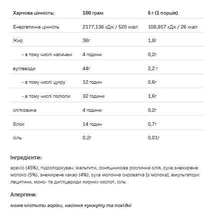 Штрихкод: 5902837743189ALLNUTRITION SAUCE NUTLOVE CRIPSY COOKIE – молочно-вершковий соус з додаванням смачного печива з какао, який працюватиме на вашій кухні як доповнення до багатьох страв або десертів. Новинка у вигляді соусу від торгової марки ALLNUTRITION відрізняється молочним смаком, що робить її неповторною, а крім того, у поєднанні зі шматочками печива та суперкремовою консистенцією, яка ідеально розтікається по поверхні кожної страви, робить її неповторною. ! Соус не містить жодних добавок у вигляді трансжирів або пальмової олії. Він підсолоджений мальтитом без додавання цукру, дуже низький вміст якого зумовлений його натуральним походженням. ALLNUTRITION SAUCE NUTLOVE CRIPSY COOKIE натхненний флагманським кремом NUTLOVE, який став бестселером у Польщі та за кордоном.