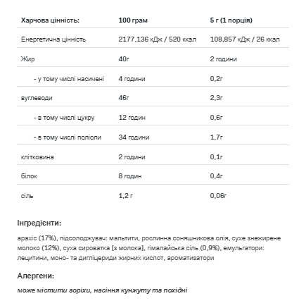 Штрихкод: 5902837743165ALLNUTRITION SAUCE NUTLOVE CRIPSY COOKIE – молочно-вершковий соус з додаванням смачного печива з какао, який працюватиме на вашій кухні як доповнення до багатьох страв або десертів. Новинка у вигляді соусу від торгової марки ALLNUTRITION відрізняється молочним смаком, що робить її неповторною, а крім того, у поєднанні зі шматочками печива та суперкремовою консистенцією, яка ідеально розтікається по поверхні кожної страви, робить її неповторною. ! Соус не містить жодних добавок у вигляді трансжирів або пальмової олії. Він підсолоджений мальтитом без додавання цукру, дуже низький вміст якого зумовлений його натуральним походженням. ALLNUTRITION SAUCE NUTLOVE CRIPSY COOKIE натхненний флагманським кремом NUTLOVE, який став бестселером у Польщі та за кордоном.