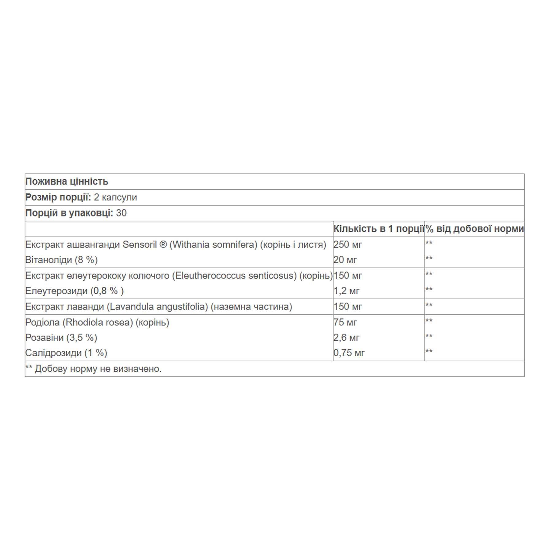Stress-Relax ® Serenity Formula ® поєднує екстракт ашваганди Sensoril™, сибірського женьшеню, родіоли та лаванди, що допомагає зменшити симптоми стресу, такі як втома, безсоння, дратівливість та нездатність зосередитися. Його гармонійне поєднання трав допомагає знизити рівень кортизолу та С-реактивного білка – біомаркерів фізичного стресу – без утворення звикання.
