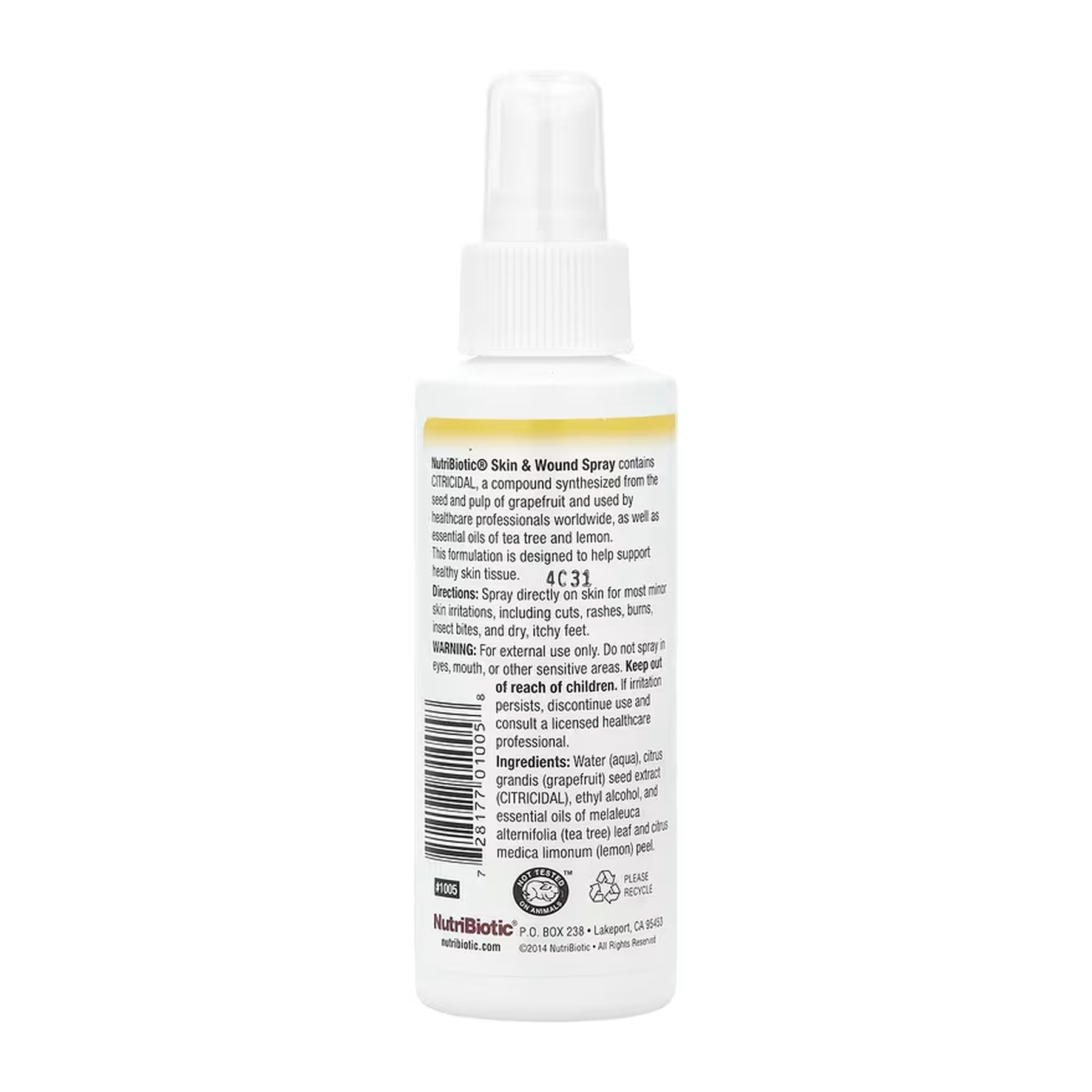 Спрей для загоєння ран на шкірі від NutriBiotic містить Citricidal — сполуку, отриману з насіння та м’якоті грейпфрута й використовується медичними працівниками по всьому світу, а також ефірні масла чайного дерева та лимона. Цей продукт допомагає підтримувати здоров’я шкіри.