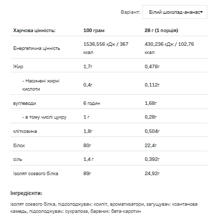 SOY PROTEIN містить ізолят соєвого білка, який є більш чистою та ціннішою формою білка, ніж концентрат, позбавлений непотрібних вуглеводів та жирів, підтримуючи концентрацію чистого білка майже 85%.
