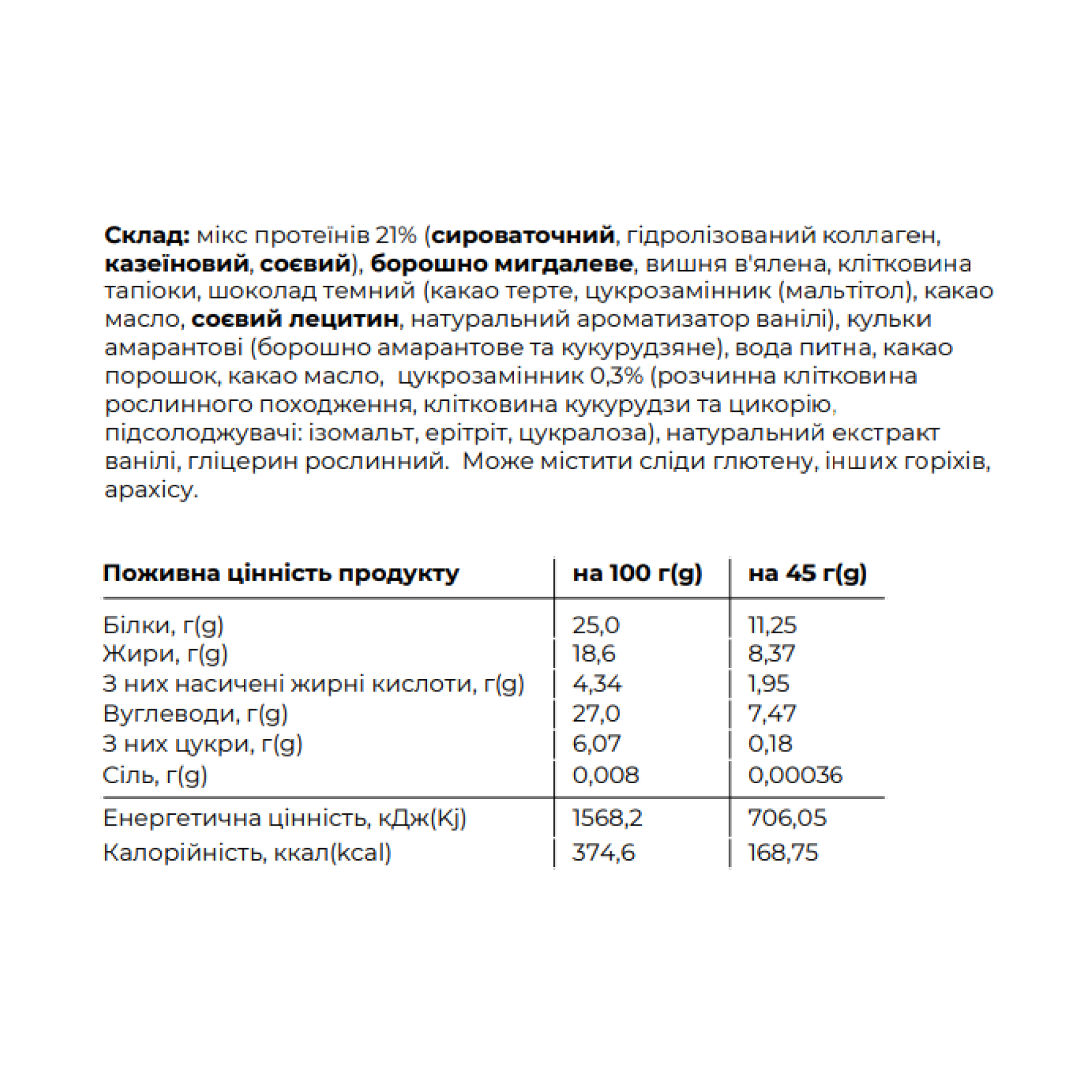 Цей протеїновий батончик стане вашим надійним супутником у повсякденному житті, забезпечуючи організм необхідними поживними речовинами та радуючи вишуканим смаком