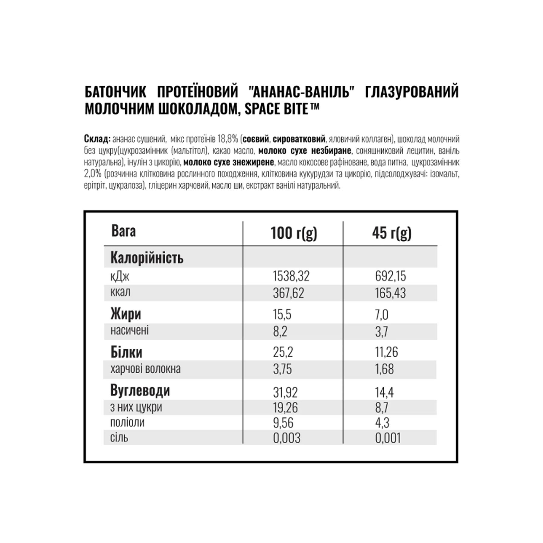 Space Bite – ідеальний вибір для тих, хто шукає корисне і смачне перекушування. Батончик забезпечує організм необхідними білками, підтримує м'язовий тонус та сприяє швидкому відновленню після фізичних навантажень. Натуральні інгредієнти та відсутність доданого цукру роблять його чудовим варіантом для прихильників здорового способу життя.