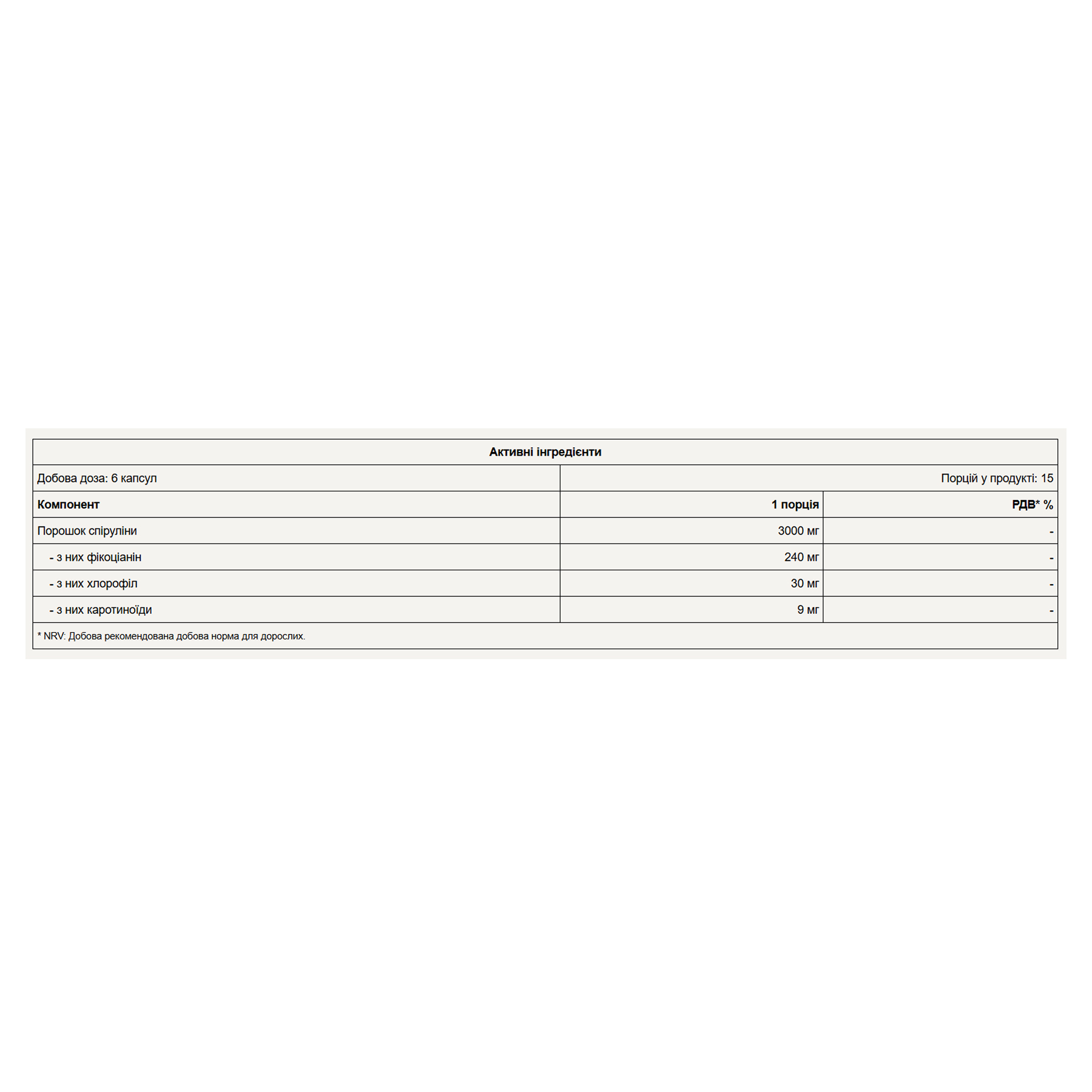 Склад : порошок спіруліни (Spirulina platensis), оболонка капсули (гідроксипропілметилцелюлоза).