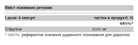 Інгредієнти: порошок Spirulina platensis, оболонка капсули (гіпромелоза)