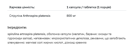 Спіруліна – повністю натуральний та комплексний препарат, призначений як доповнення до щоденного раціону з необхідними макро- та мікроелементами, особливо в зимовий період та при використанні редукційних дієт.
