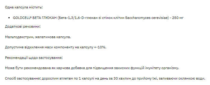 Натуральний полісахарид, що має виражені імуномодулюючі властивості. Бета глюкани істотно впливають на функціональність імунної системи. Підвищення імунітету сприяє кращій обороні організму перед паразитами, вірусами, бактеріями та грибками, а також проти абераційного росту клітин (Wasser та колектив, 1999), при профілактиці та лікуванні онкологічних захворювань. Показання для застосування бета глюкану: різні інфекції, високий рівень холестерину, ослаблення імунної системи, алергії, синдром хронічної втоми, переохолодження, застуда, стрес, загальна перевтома організму, гастродуоденальні виразкові ураження, для підтримки системи кровотворення, додаткове. Одна капсула містить: GOLDCELL БЕТА ГЛЮКАН (Бета-1,3/1,6-D-глюкан зі стінок клітин Saccharomyces cerevisiae) – 250 мг Додаткові речовини: Мальтодекстрин, желатинова капсула. Допустиме відхилення маси компонента на капсулу +-10%. Рекомендації щодо застосування: Може бути рекомендована як харчова добавка для підвищення захисних функцій імунітету організму. Спосіб застосування: дорослим атлетам по 1 капсулі на день за 30 хвилин до їди запиваючи склянкою води. Застереження: не перевищувати денну кількість, що рекомендується. Протипоказання: індивідуальна непереносимість компонентів продукту, дітям, вагітним та в період лактації. Упаковка: полімерні банки по 60 капсул. У сухому, захищеному від сонця місці при температурі від 5' до 25' та відносній вологості повітря не більше 75%; у недоступному для дітей місці. Термін придатності до споживання: 24 місяці від дати виготовлення.