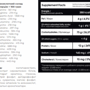 Це гейнер, що містить високоякісний сироватковий білок (виробництво Голландія) та вуглеводи (мальтодекстрин, глюкоза, складні вуглеводи), завдяки чому має високий анаболічний ефект.