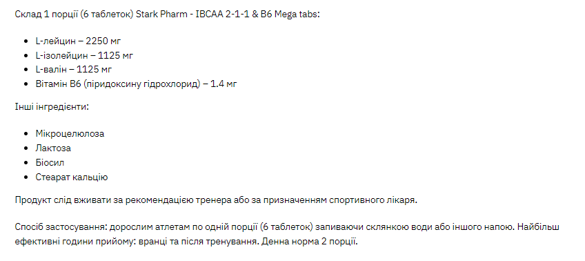 Склад 1 порції (6 таблеток) Stark Pharm – IBCAA 2-1-1 & B6 Mega tabs: